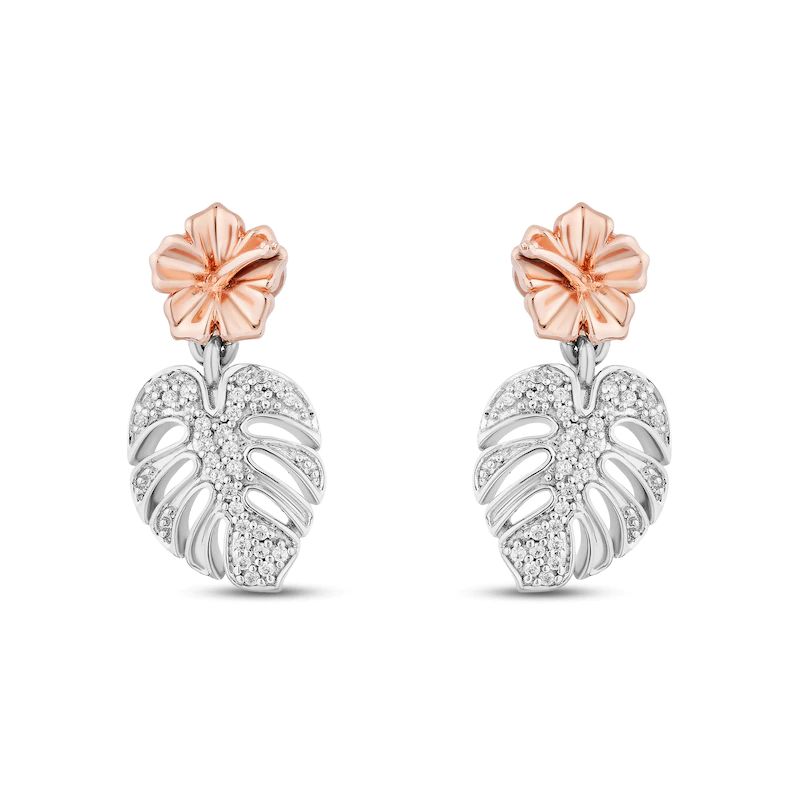 Featuring a tropical design, these earrings feature 10K rose gold hibiscus flowers shimmering on the posts while glittering round diamonds sparkle on the dangling leaves. The earrings have a total diamond weight of 1/10 carat and are secured with a friction back.